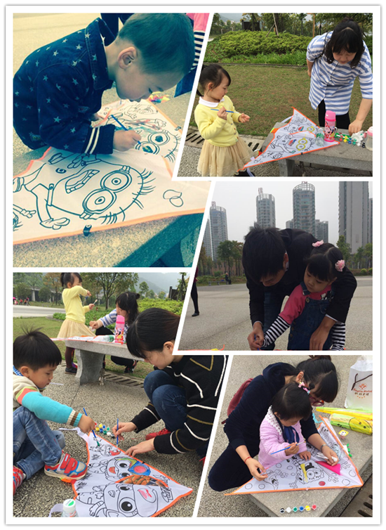 大家自己动手描绘风筝图画,童真与笑脸交织着绘画出孩子们的美好梦想,关心与疼爱描绘出家长们的殷切希望。