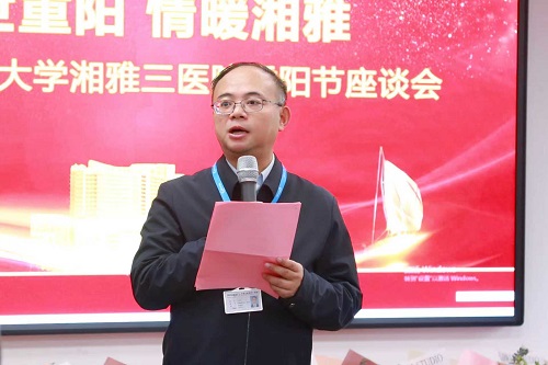 金秋送爽,又逢重阳。10月27日下午,在一年一度的九九重阳节即将到来之际,中南大学湘雅三医院2025年离退休人员重阳节座谈会在离退休人员活动室举行。中南大学离退休工作处党委书记何桂强,院领导何庆南、江泓、张劲强、费云、曹科、容鹏飞以及相关职能部门负责人、青年教师代表、学生代表与退休的老领导、老同志欢聚一堂,共叙情谊,同庆佳节。座谈会由党委委员、副院长曹科主持。