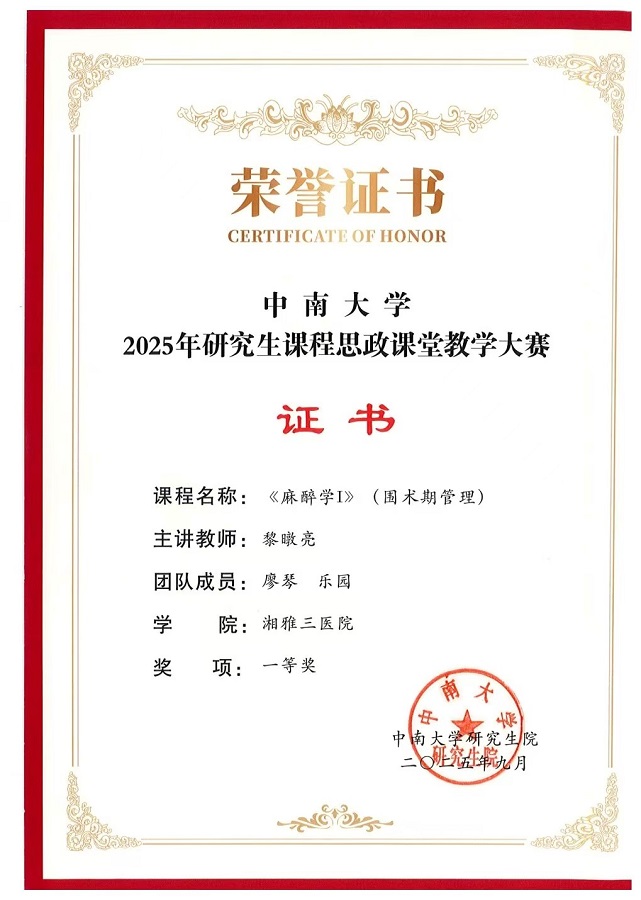 作为长期深耕临床与教学一线的青年学者,黎暾亮博士的教学实践始终贯穿“专业筑基、思政铸魂”的理念。其参赛课程深度挖掘麻醉学中的思政元素,以“临床案例为骨、人文精神为脉”,构建了特色鲜明的教学体系。 “理论+实践+价值引领”的融合模式,既贴合麻醉学研究生培养需求,更实现了思政教育与专业教学的自然共生,获得评委“案例鲜活、立意深刻”的高度评价。“这份荣誉是对个人的肯定,更是医院课程思政建设成果的缩影,是院领导支持下,研究生部与麻醉教研室通力协作取得的成果。”黎暾亮博士表示。