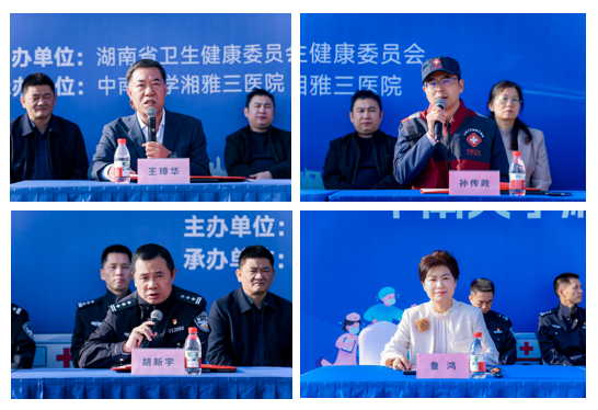 11月14日上午,中南大学湘雅三医院医疗应急综合演练正式举行。湖南省卫生健康委医疗应急处处长王璋华、湘雅三医院副院长孙传政、长沙市公安局交管支队副支队长胡新宇、长沙湘江通航有限公司党支部书记、执行董事鲁鸿等出席演练开幕式,刘作良主持。开幕式上,孙传政指出,医院高度重视医疗应急紧急医学救援能力建设,本次演练旨在进一步检验我院应急预案的科学性与可行性,并通过联动多单位、多部门、多专科,磨合协同作战机制,提升医院在复杂场景下的现场救治、伤员转运和资源调度能力。胡新宇表示,顺畅、高效、安全的交通保障是医疗应急救援中不可或缺的关键一环,全市交管部门将以此为契机,进一步强化与医疗应急队伍的深度融合与协同,为急救“生命线”提供最坚实的地面支撑。王璋华充分肯定了湘雅三医院在突发公共卫生事件应对、灾害医疗救援等方面的突出贡献,并强调,全球公共卫生风险复杂多变,各类突发疾病、自然灾害等事件频发,加强医疗应急体系建设,不仅是卫生健康事业发展的内在需要,更是维护社会稳定、保障民生安全的重要基石。