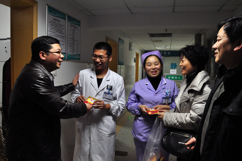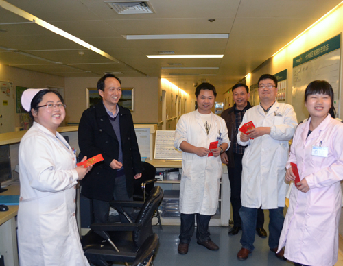 1月30日晚,农历除夕。院领导吴希林、朱晒红、黄飞舟、邓云龙、杨飞龙,以及党办、院办、人力资源部、医务部、护理部等职能部门负责人,看望并慰问坚守在一线医护人员、行政后勤人员,代表医院党政向他们致以新年的祝福和新春的问候。