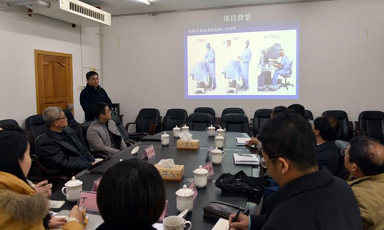 12月8日下午,湖南省经济和信息化委员会副主任陈松岭、副巡视员杨宪法、电子通讯产业处处长彭涛以及湖南省医疗器械行业协会会长宋广征、科技服务部部长丁玲等领导和专家一行来到湘雅三医院就“妙手S”国产手术机器人及微创手术器械研发及临床应用进行调研指导。朱晒红副院长参加会谈,相关研究人员王国慧、易波博士向领导和专家汇报“妙手S”国产手术机器人及微创手术器械研发及临床应用现况。